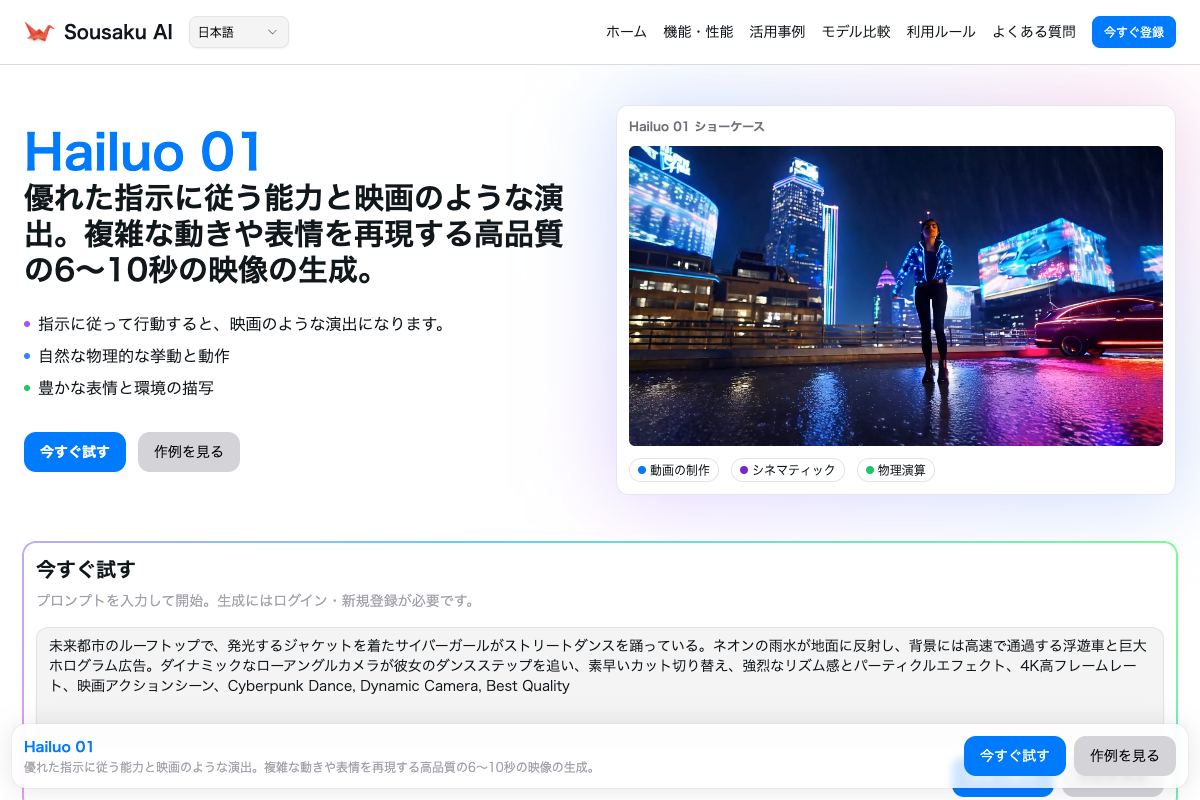 Sousaku.AIのWebプラットフォーム上でも、Hailuo 01を活用して高品質なフォトリアル動画を生成することが可能です。複雑な動作や繊細な表情変化を伴うシネマティックな映像制作において、強力な基盤を提供します。
