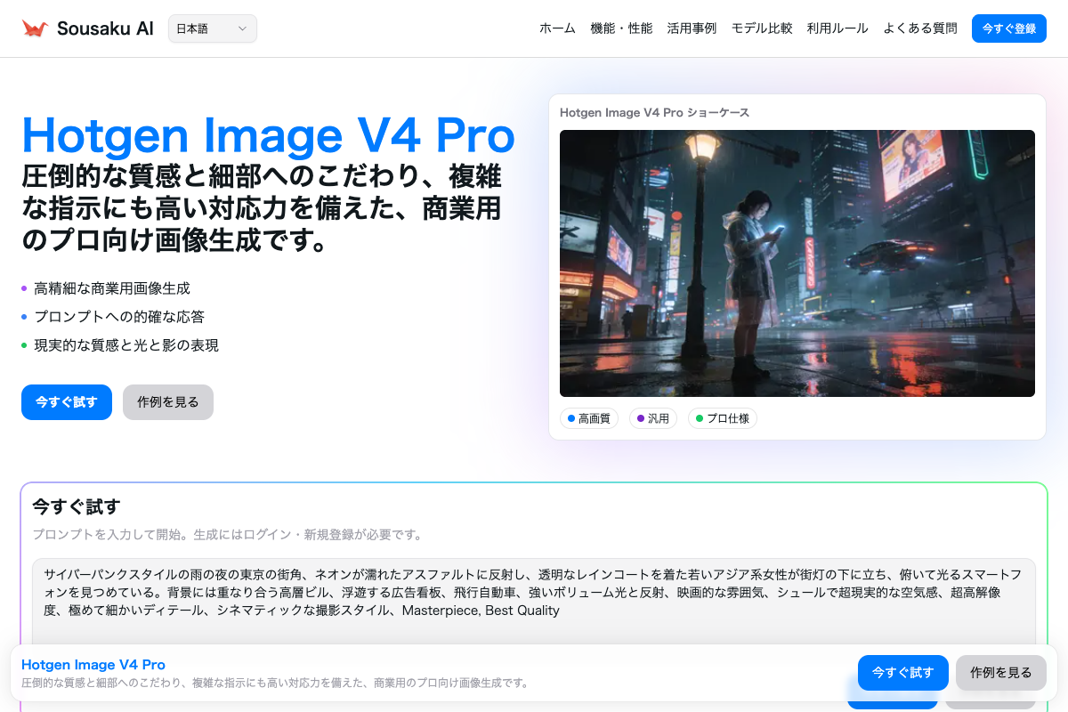 Hotgen Image V4 Proは、極めて高いレンダリング解像度と材質のリアルさを備え、EC商品画像の制作において極めて適性が高いAIモデルです。 プロのカメラマンによるスタジオ撮影や、高度なCGレタッチに匹敵するクオリティのビジュアルを効率的に生成できます。 現在、ポイント消費型のWebプラットフォームであるSousaku.AIにて、この強力なモデルをスムーズに利用することが可能です。
