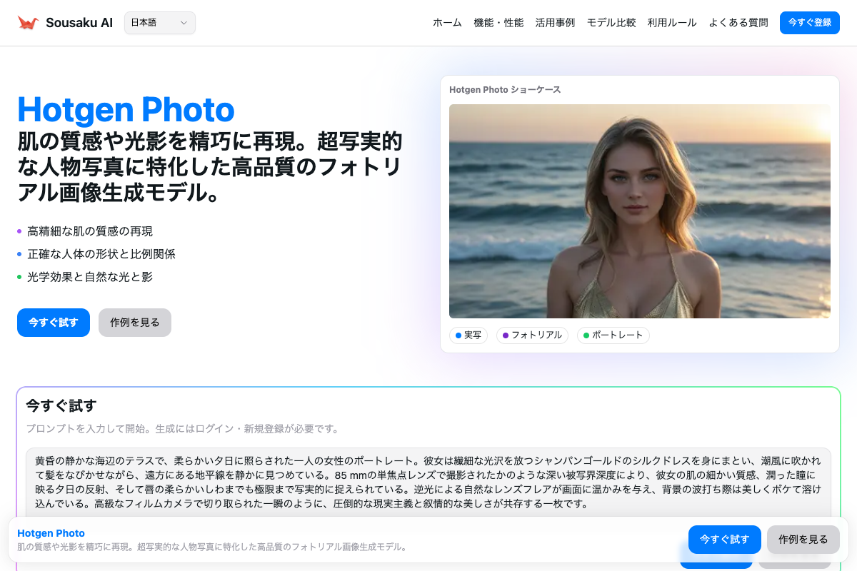 Hotgen Photoは、Hotgenシリーズの中でも純粋な写真・ポートレート表現に特化したテキストから画像生成(Text-to-Image)モデルです。アニメ調やイラスト風の要素を削ぎ落とし、現実の人間と見紛うほどの超写実的な表現を得意としているため、この用途において極めて適性が高いと言えます。