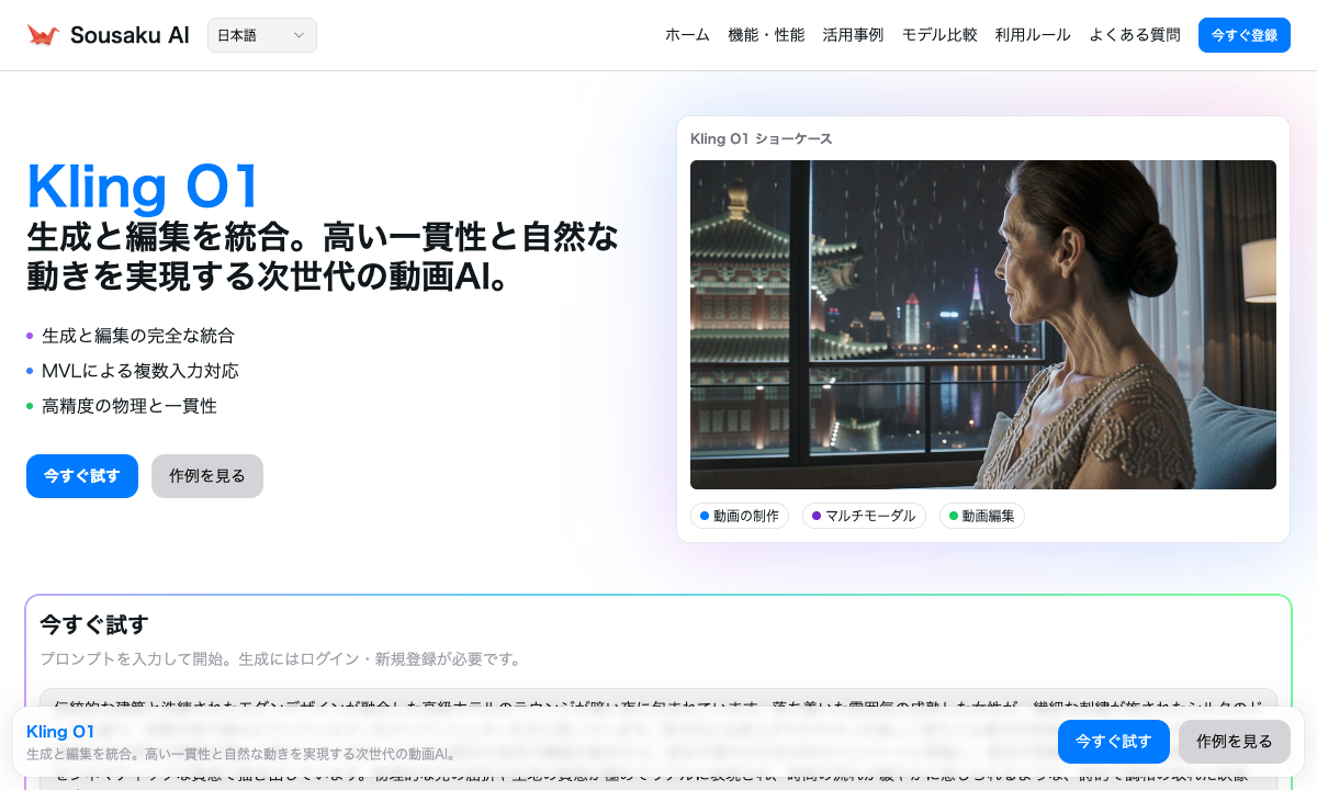 Sousaku.AIのプラットフォームで、Kling O1の高度な動画生成ワークフローを実際に体験してみてください。