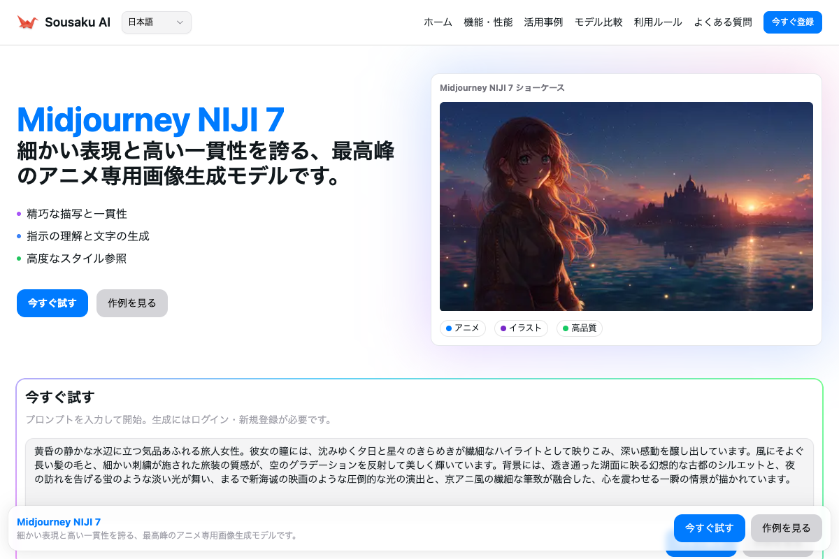 Sousaku.AIのプラットフォームで、Midjourney NIJI 7によるセル画風の生成を直接体験し、他のモデルとの表現力の違いを探索してみてください。 公式サイトへアクセスして探索する: https://sousaku.ai