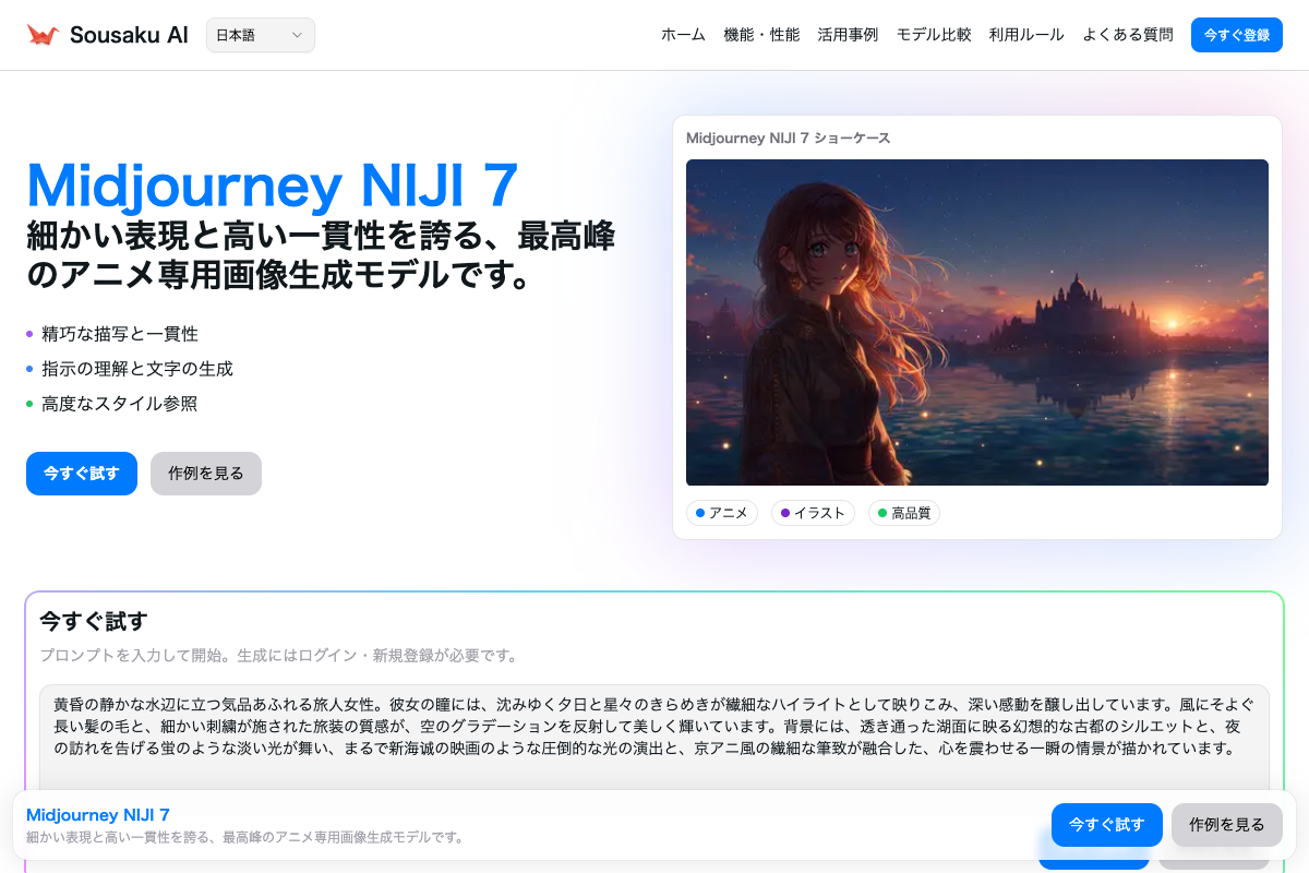 まずはご自身の目で、NIJI 7 が描く手描き風のクオリティと表現力を確かめてみてください。Sousaku.AI の環境で、新しい創作の可能性を探索してみましょう。