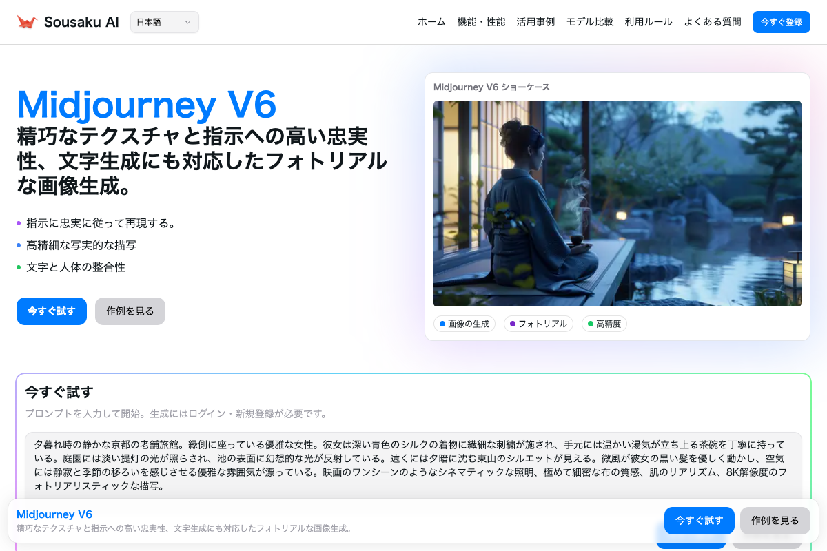 - Midjourney V6 の詳細を確認する:https://sousaku.ai/models/mj-image-v6