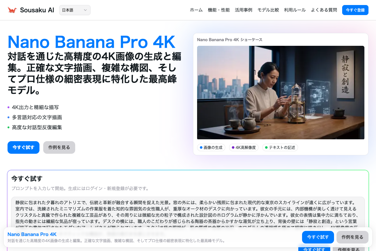 - Nano Banana Pro 4Kのモデル詳細を見る:https://sousaku.ai/models/nano-banana-pro-4k