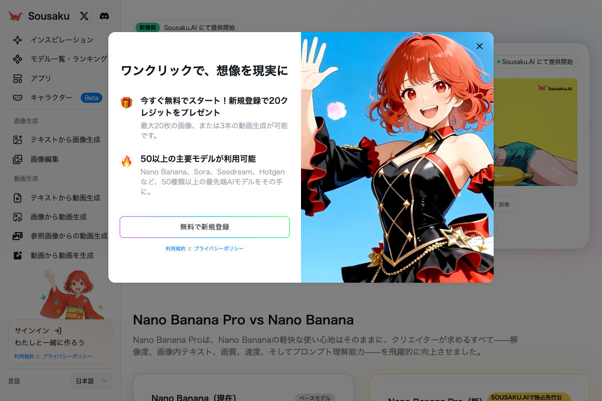 まずはSousaku.AIにアクセスし、Nano Bananaの詳細を確認して、実際の生成スピードを体験してみてください。日々のSNS運用業務を効率化するために、ぜひアカウントを作成して創作を開始し、そのポテンシャルをご自身で比較・検証してみてください。