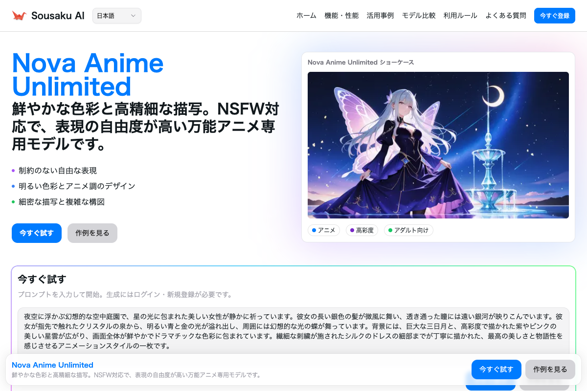 Nova Anime Unlimitedは、高い彩度と鮮やかな色彩表現、そして優れたアニメ調の描写力を持つテキストから画像生成(Text-to-Image)モデルです。構図の自由度や細部の密度が高く、複数のキャラクターが織りなす複雑なシーンの処理にも優れています。