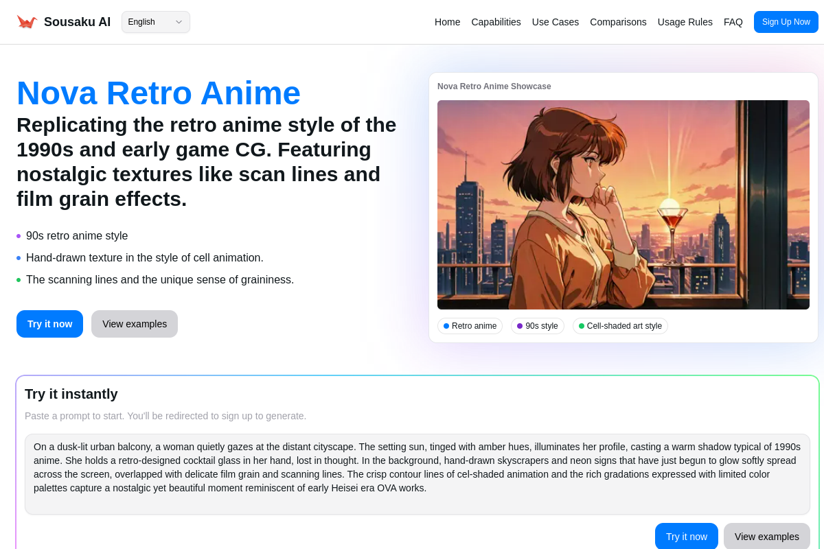 Sousaku.AIで利用可能な Nova Retro Anime は、まさにこのトレンドに合致するモデルです。90年代のセル画アニメ特有の質感、アナログなノイズ感、そして独特の色使いを再現することで、商品に「時代を超えた物語」を付与します。本記事では、このモデルを使用して、魅力的な商品ビジュアルを作成するための具体的な手法とノウハウを解説します。