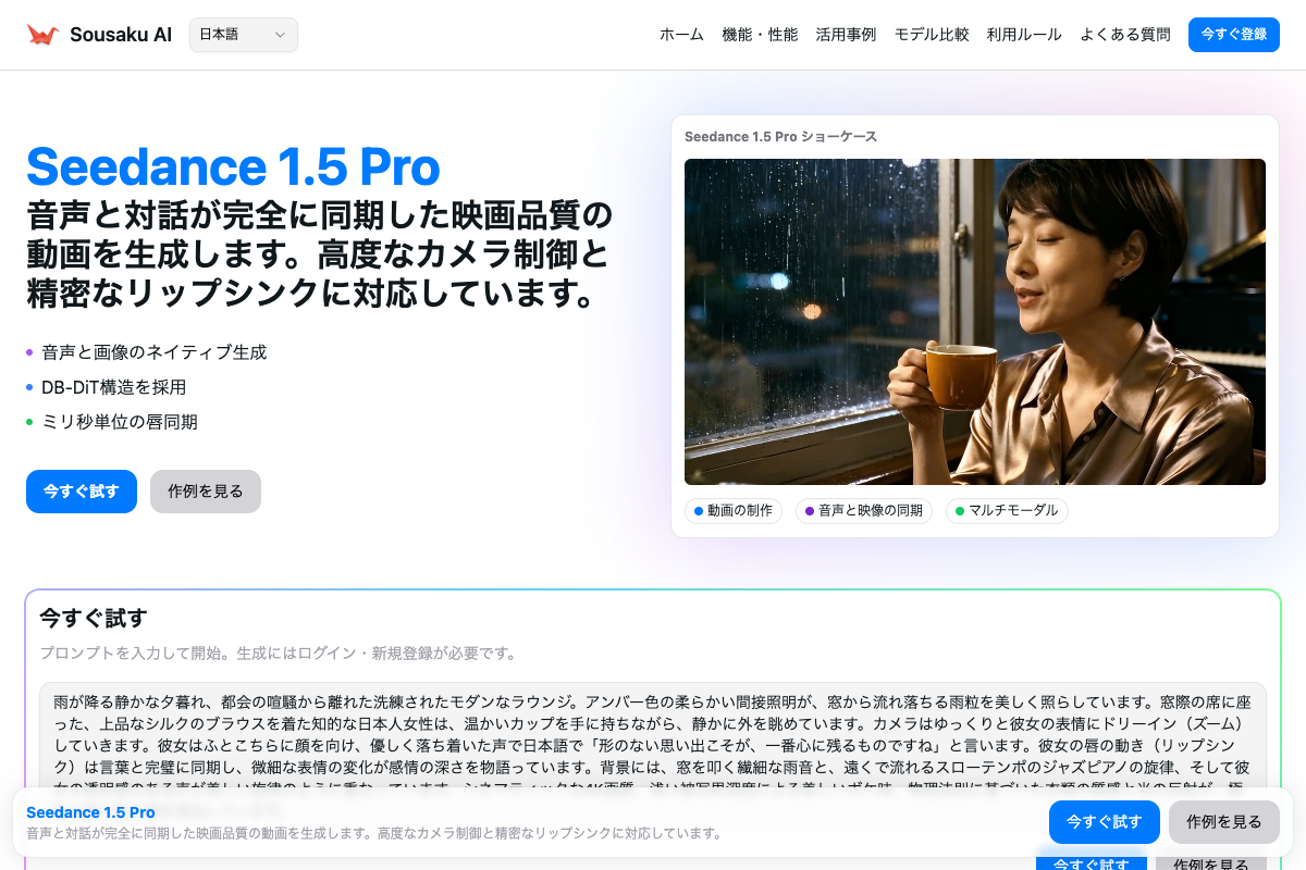 テキストから動画生成機能を使用する場合: https://sousaku.ai/create/text2video/seedance-pro-1.5